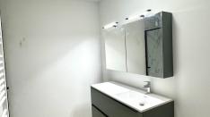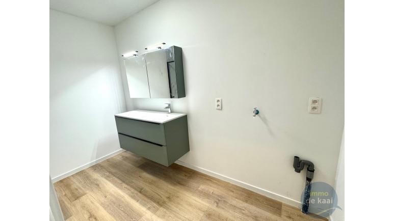 Ruime badkamer met mooie douche, lavabo en aansluiting voor wasmachine. Toilet afzonderlijk.