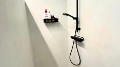 De badkamer heeft een inloopdouche in mortex en een ruime lavabomeubel.