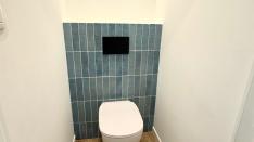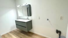 Ruime badkamer met mooie douche, lavabo en aansluiting voor wasmachine. Toilet afzonderlijk.