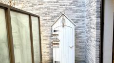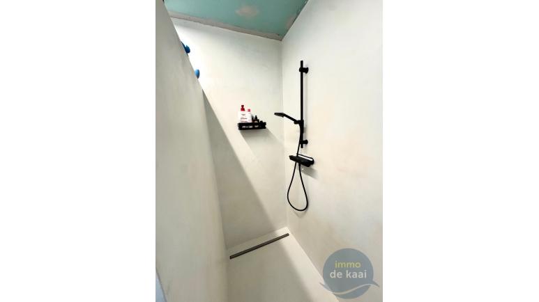 De badkamer heeft een inloopdouche in mortex en een ruime lavabomeubel.
